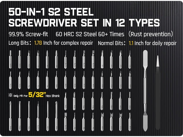 Equipped with 50 precision bits across 9 categories, this mini electric screwdriver is ready for a wide range of repair tasks. Each bit is crafted from hardened S2 steel for durability and long-lasting performance. Quality tools help you achieve quality results.