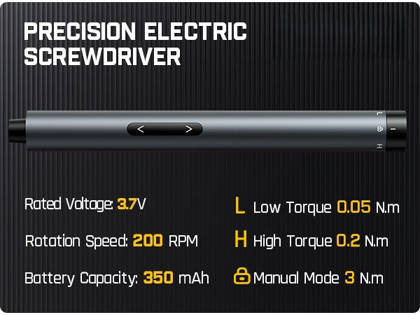 Featuring adjustable torque settings of 0.2 Nm (high) and 0.05 Nm (low), plus a manual torque of up to 3 Nm, the E1 MAX Precision Electric Screwdriver delivers accurate power for detailed work. Perfect for smartphones, watches, smart bracelets, cameras, and other precision devices.
