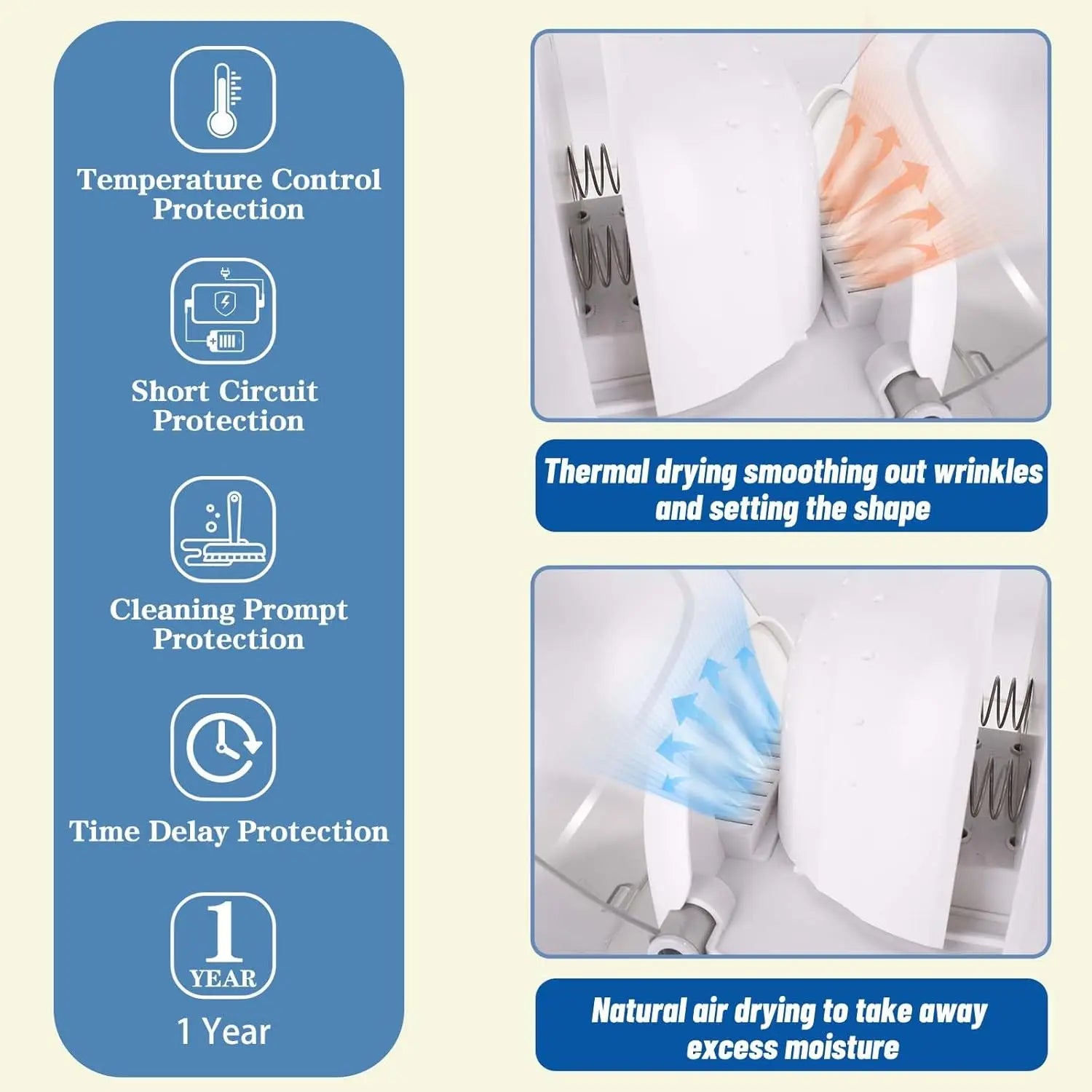 It has four functions. 1. Automatic: including 5 minutes of 248℉ steam cleaning&ironging,10 minutes of thermal drying and 5 minutes of natural air drying. 2. Steam: 82 steam injection holes to eject steam for 360° cleaning&ironing caps. 3.Heat: thermal drying quickly evaporates moisture,smoothing out wrinkles and quickly setting the shape. 4. Cool: natural air drying to take away excess moisture.Suitable for trucker cap,baseball cap,bengals cap,bucket hat,gentleman hat,beanie hat,cloche hat etc.