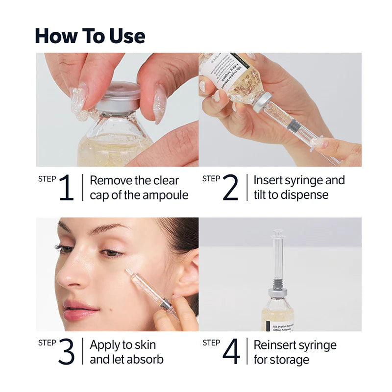 Insert the provided hygienic syringe into the ampoule. Tilt the vial at a slight angle to smoothly draw the serum into the syringe.STEP 3: APPLY & ABSORB