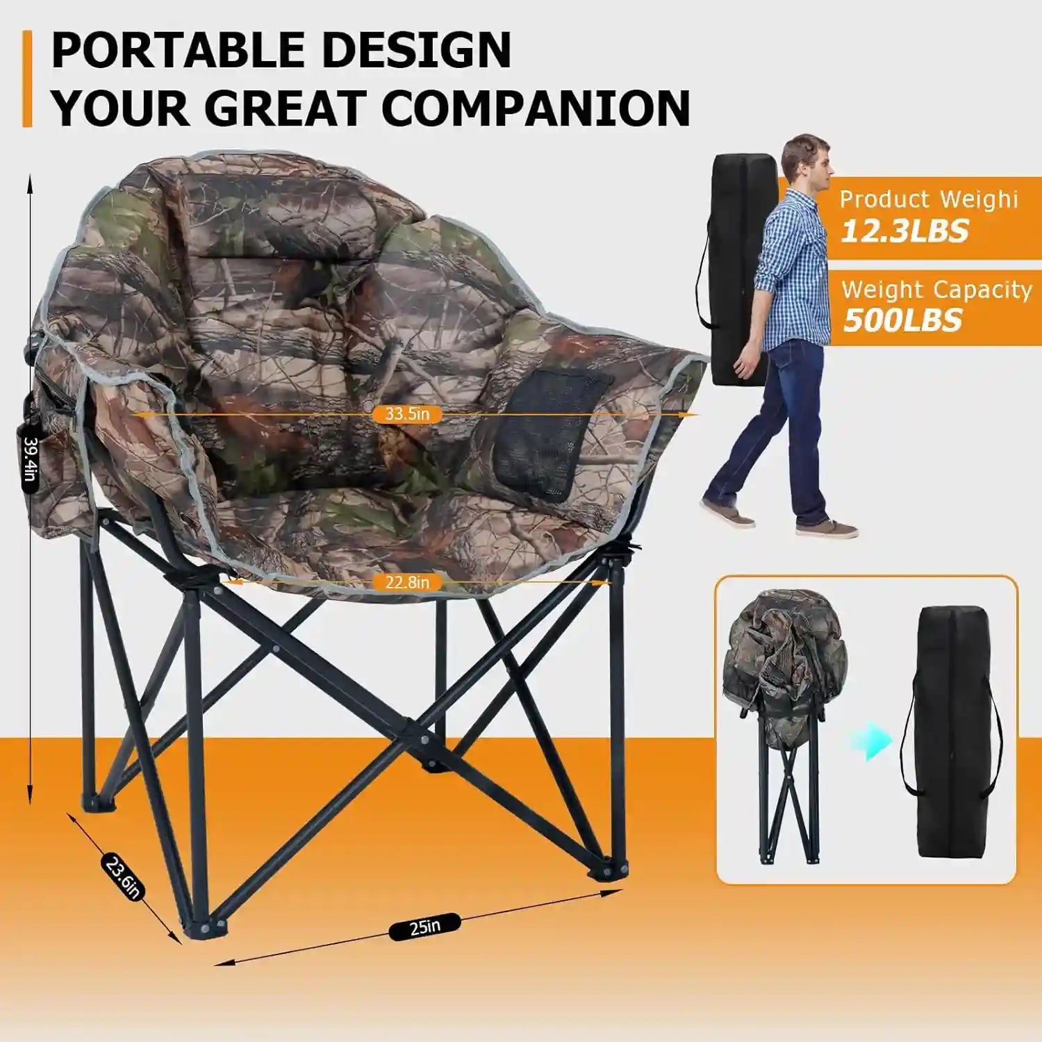 【DURABLE FRAME】Made with premium, high-quality materials, this camping chair is built to last. The sturdy steel frame construction can withstand up to 500 pounds of weight. Padded Seat & Back can provide extra comfort while sitting on it.