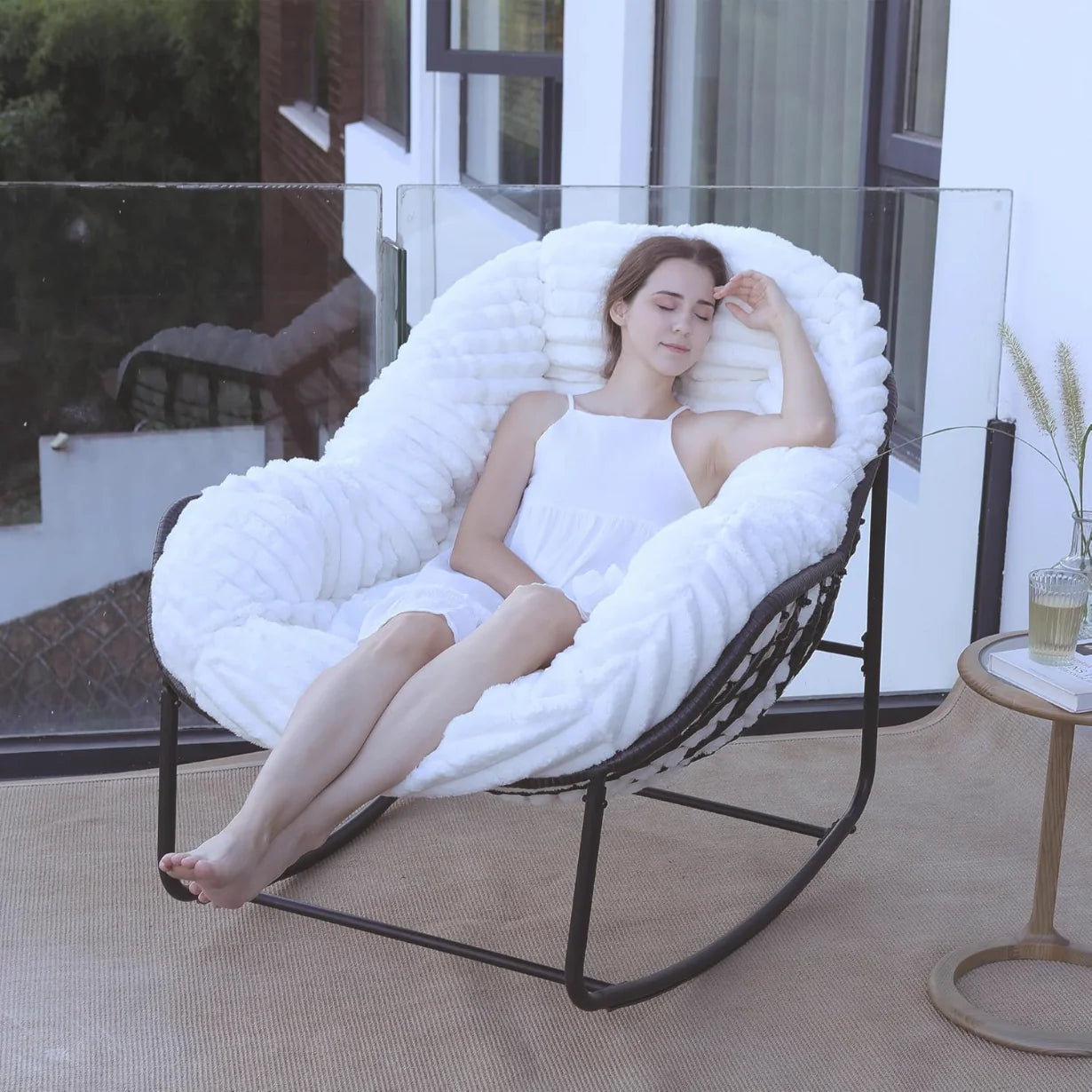 Wrapped in velvety upholstery and filled with plush, cloud-like padding, this indoor rocker invites you to pause, breathe, and sink into deep relaxation.